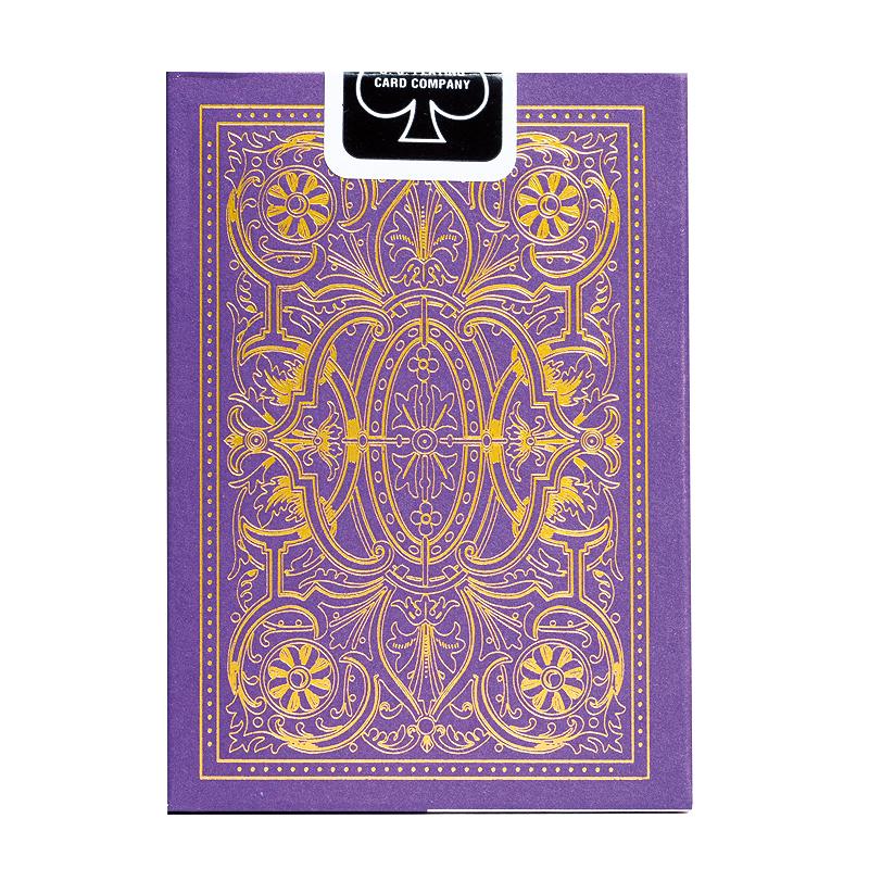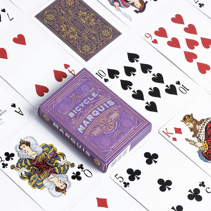 Les cartes à jouer Bicycle Marquis présentent un design luxueux et complexe qui évoque l’esprit Art déco des années 1920 et 1930. L’étui de rangement est imprimé sur un magnifique papier non couché couleur prune pour un toucher ultra premium. Le motif présente le logo Bicycle et d’autres textes dans un superbe film holographique, le tout rehaussé d’un filigrane complexe dans une superbe feuille d’or. L’étui et le dos de la carte sont inspirés du jeu Cruiser n° 96 d’Andrew Dougherty, imprimé pour la première fois au début des années 1900.