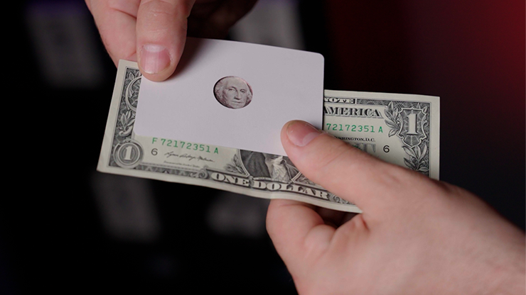 Une carte est montrée recto verso ; elle présente un grand trou au centre. On emprunte un billet, par exemple un dollar (ce tour fonctionne aussi bien avec les dollars qu’avec les livres sterling et les euros). La carte trouée est placée sur le billet, révélant le visage de George Washington. Sans aucun mouvement, faites glisser la tête de George Washington vers le haut du billet, puis vers la droite et enfin vers la gauche. Remettez-la ensuite sur ses épaules. Rendez immédiatement le billet emprunté et montrez la carte recto verso. Ce gimmick est fabriqué sur mesure et existe en versions 1 $, 5 £ et 10 €. Instructions en ligne détaillées et idées de bonus disponibles.