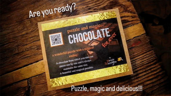 Ceci se reproduit deux fois de plus… au total, 3 morceaux sont retirés, et le chocolat ne perd jamais sa taille. Comme surprise finale, un vrai chocolat apparaît à l’intérieur de la boîte d’où il a été retiré, pour que vous puissiez le manger et le partager.
