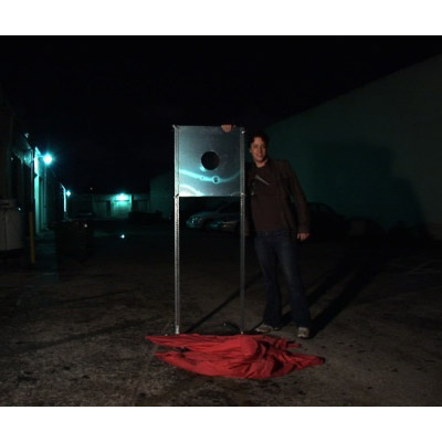 Des spectateurs sont invités sur scène à examiner une plaque de métal de 60 cm de diamètre percée d’un trou de 18 cm en son centre. Une fois l’examen terminé, ils sont invités à s’asseoir. L’illusionniste passe alors un bras à travers le trou et agrippe le bord d’un rideau. La plaque de métal emprisonne son bras et le sépare du devant de la scène. D’un mouvement brusque, le magicien se retrouve devant la plaque, comme s’il l’avait traversée ou s’était téléporté d’un côté à l’autre.
