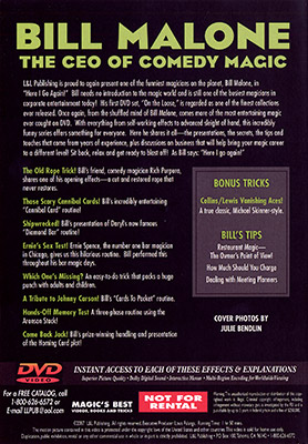 L&L Publishing est fier de présenter à nouveau l’un des magiciens les plus drôles de la planète, Bill Malone, dans « Me revoilà ! » Bill n’a plus besoin d’être présenté dans le monde de la magie et reste l’un des magiciens les plus sollicités dans le secteur du divertissement d’entreprise ! Son premier coffret DVD, « On the Loose », est considéré comme l’une des meilleures collections jamais sorties. Une fois de plus, l’esprit débordant de Bill Malone nous offre des tours de magie parmi les plus divertissants jamais filmés. Des effets automatiques aux tours de passe-passe les plus complexes, cette série hilarante a de quoi plaire à tous. Il partage ici tout : ses présentations, ses secrets, ses astuces et ses conseils acquis au fil des années d’expérience, ainsi que des conseils business pour vous aider à propulser votre carrière de magicien vers de nouveaux sommets ! Installez-vous confortablement et préparez-vous à décoller ! Comme le dit Bill : « Me revoilà ! » Le vieux tour de la corde ! L’ami de Bill, le magicien humoriste Rich Purpura, partage l’un de ses effets d’ouverture : une corde coupée et réparée qui ne se répare jamais.
