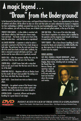 Dans la préface des notes de cours de Steve Draun, le légendaire magicien Edward Marlo écrivait : « Steve est très sélectif dans le choix de ses méthodes et de ses effets. Tous ses tours sont directs et leurs mécanismes sont facilement compréhensibles par les profanes comme par les magiciens, mais leur méthodologie est habilement dissimulée, même aux experts les plus avertis. » Aujourd’hui, pour la première fois devant un public, vous verrez Steve Draun, l’un des élèves les plus brillants et les plus doués de Marlo, au sommet de son art.
