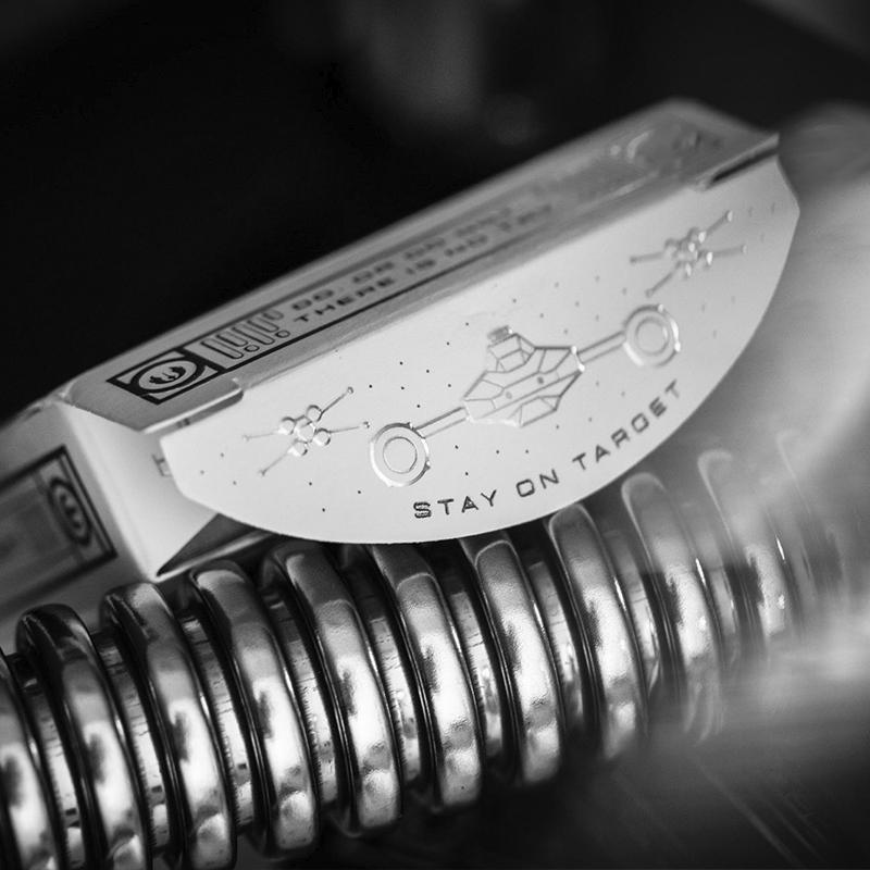 Sur le dos blanc, découvrez d’innombrables détails, du haut de R2-D2 au symbole de l’Alliance rebelle. Au centre, un motif répétitif de chasseurs X-wing soutient deux sabres laser de chaque côté.